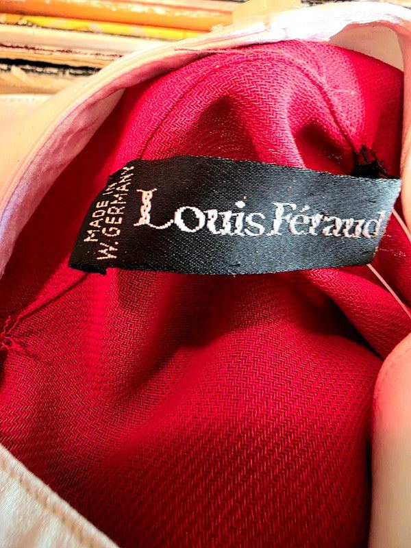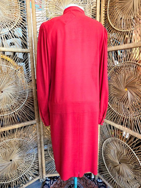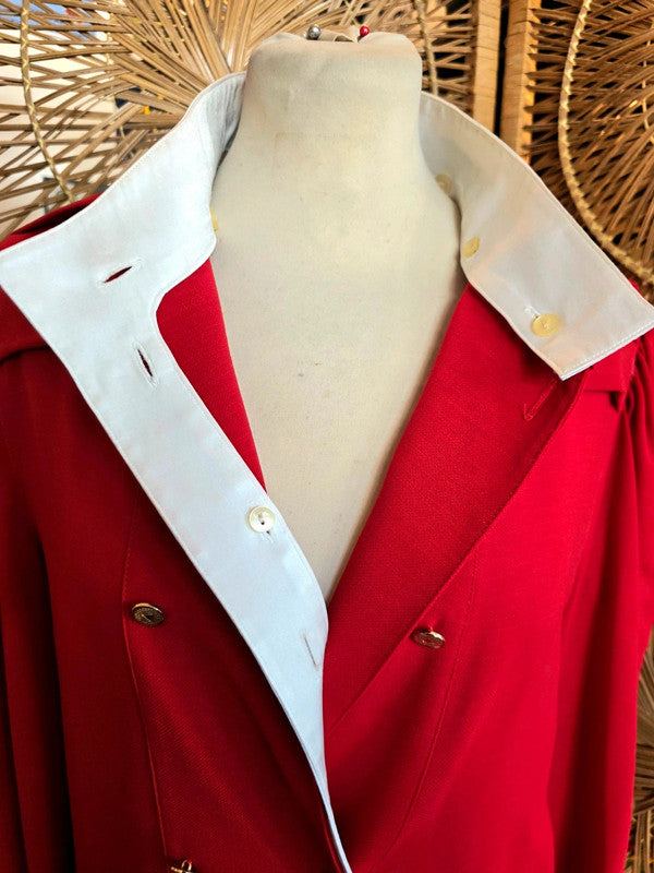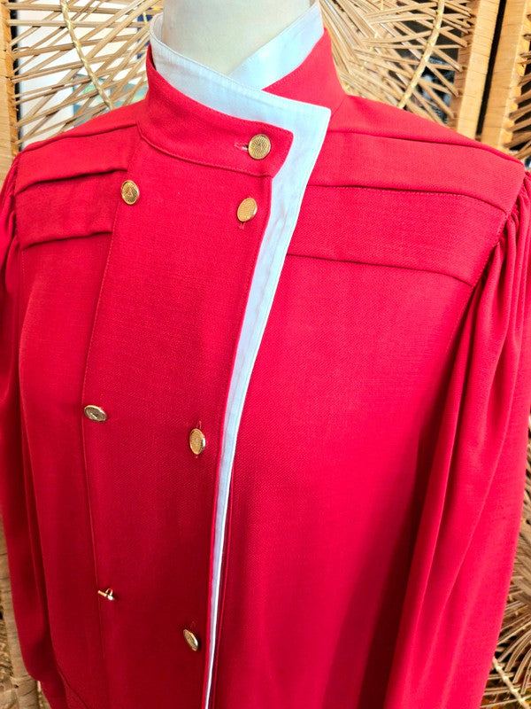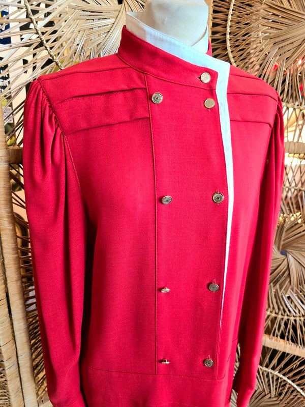 This gorgeous dress is by the brand Louis Féraud and has a red design with white accents. The buttons are gold for a classy look and can be opened to adjust the neckline to your preference. Made in West Germany.
