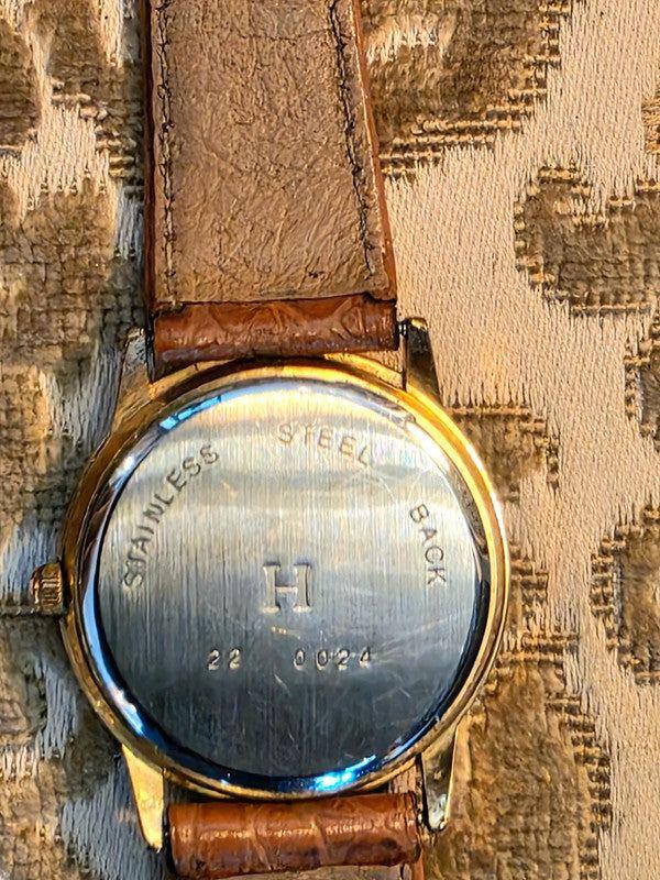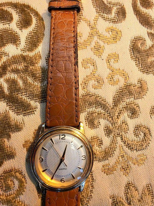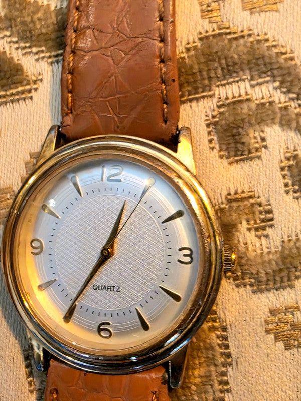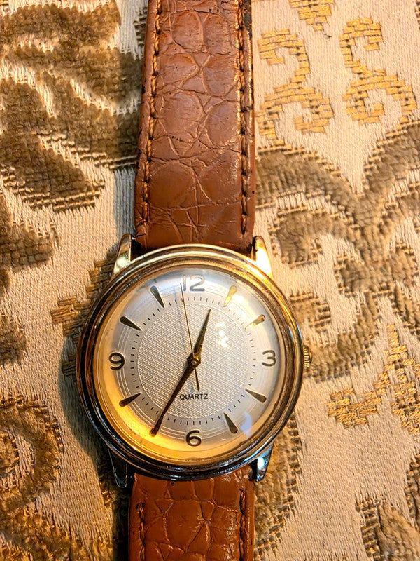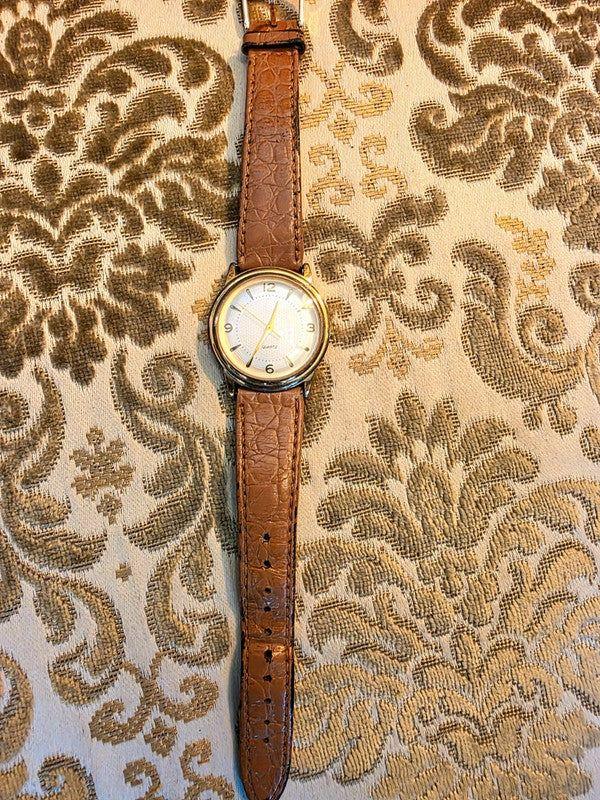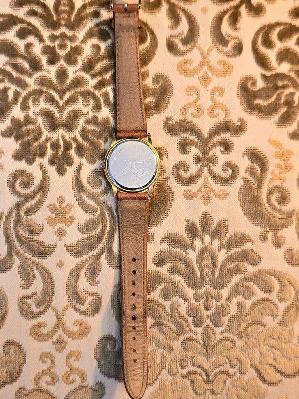 Stunning vintage watch. The front is gold toned, while the back is silver toned and made of stainless steel. The dial is white/silver coloured with gold toned hour markers and black lettering. The wristband is brown and made of leather. This watch is vintage and pre-owned, so it has some signs of use, but still looks good considering its age.