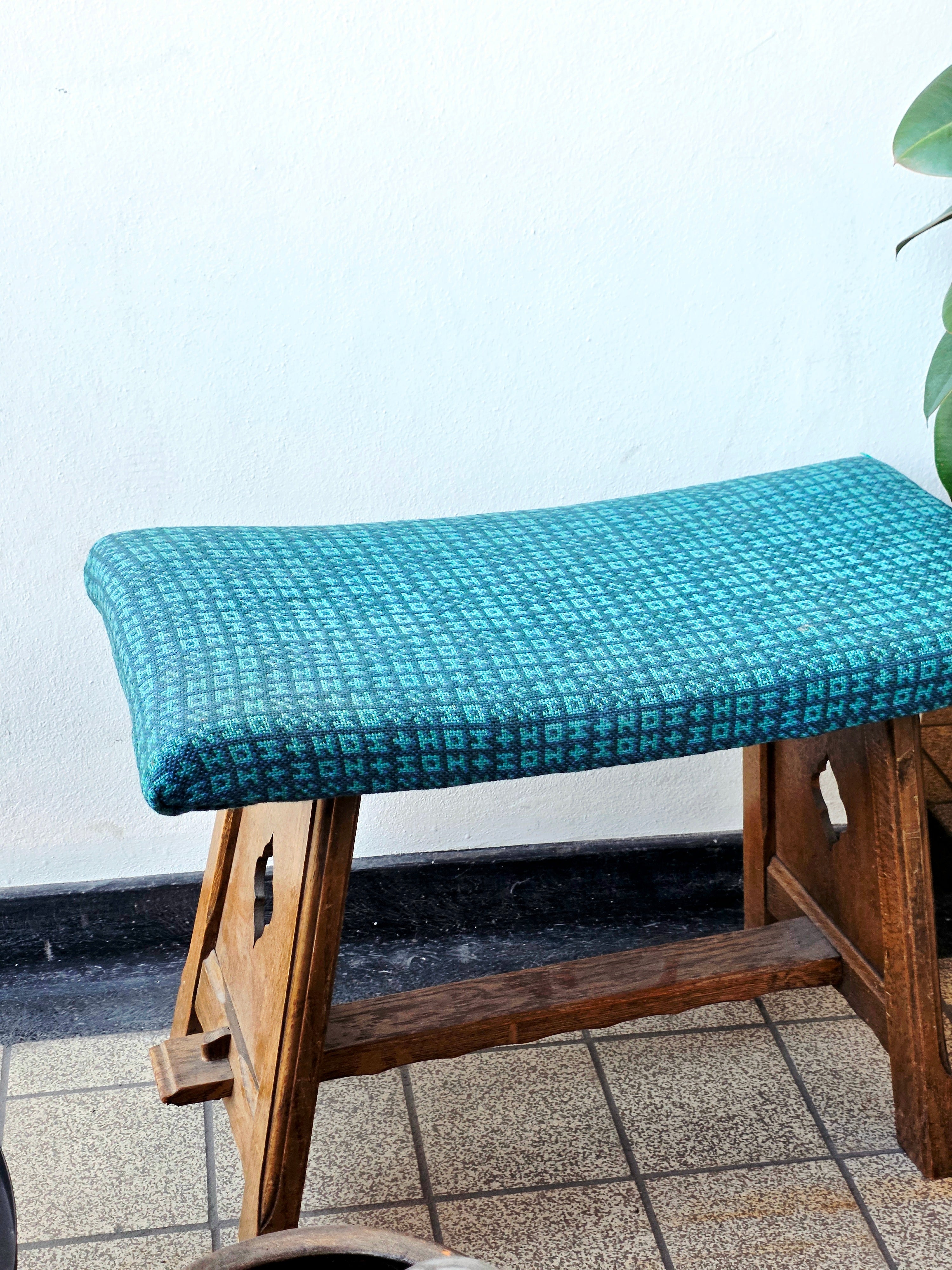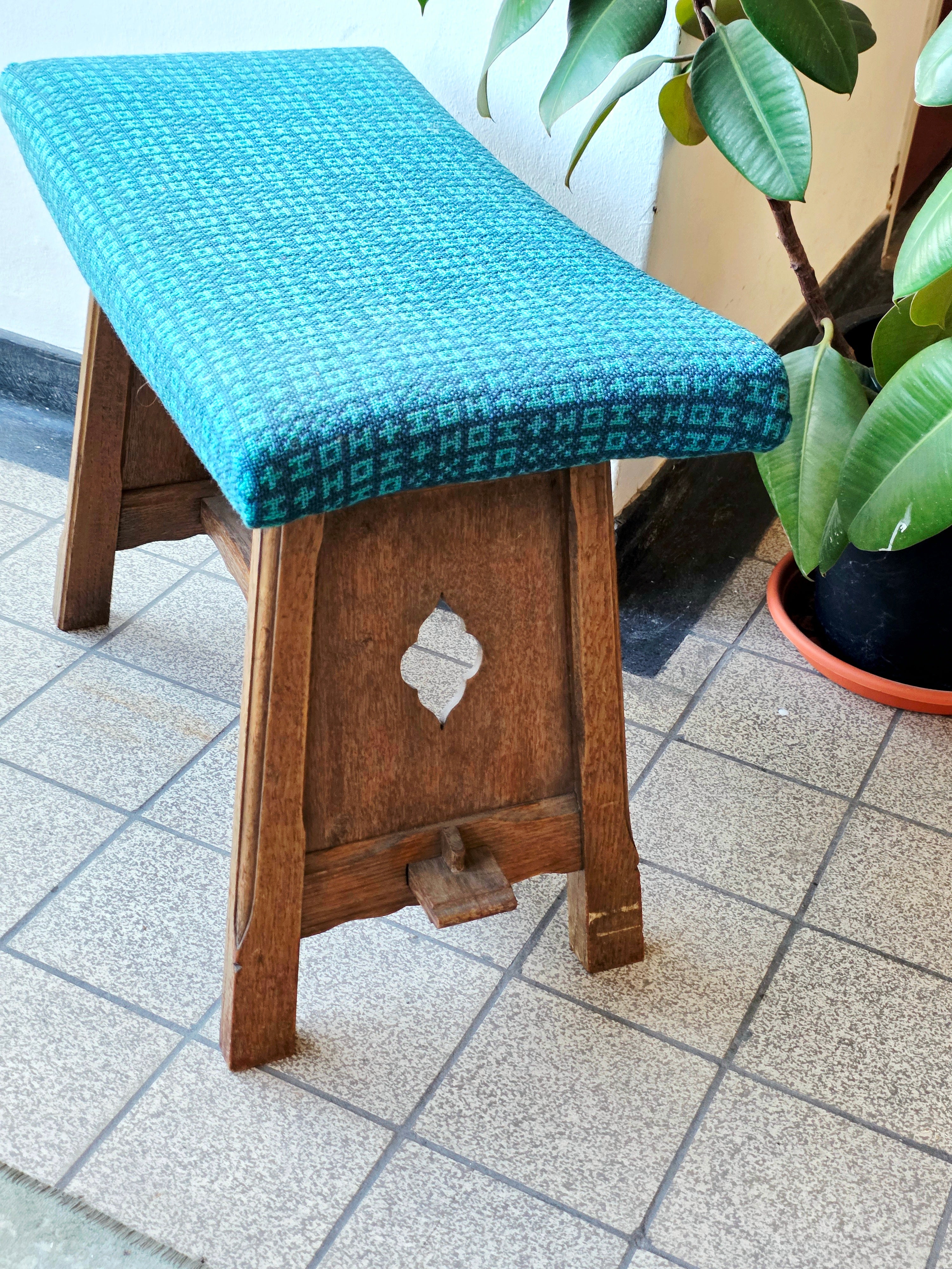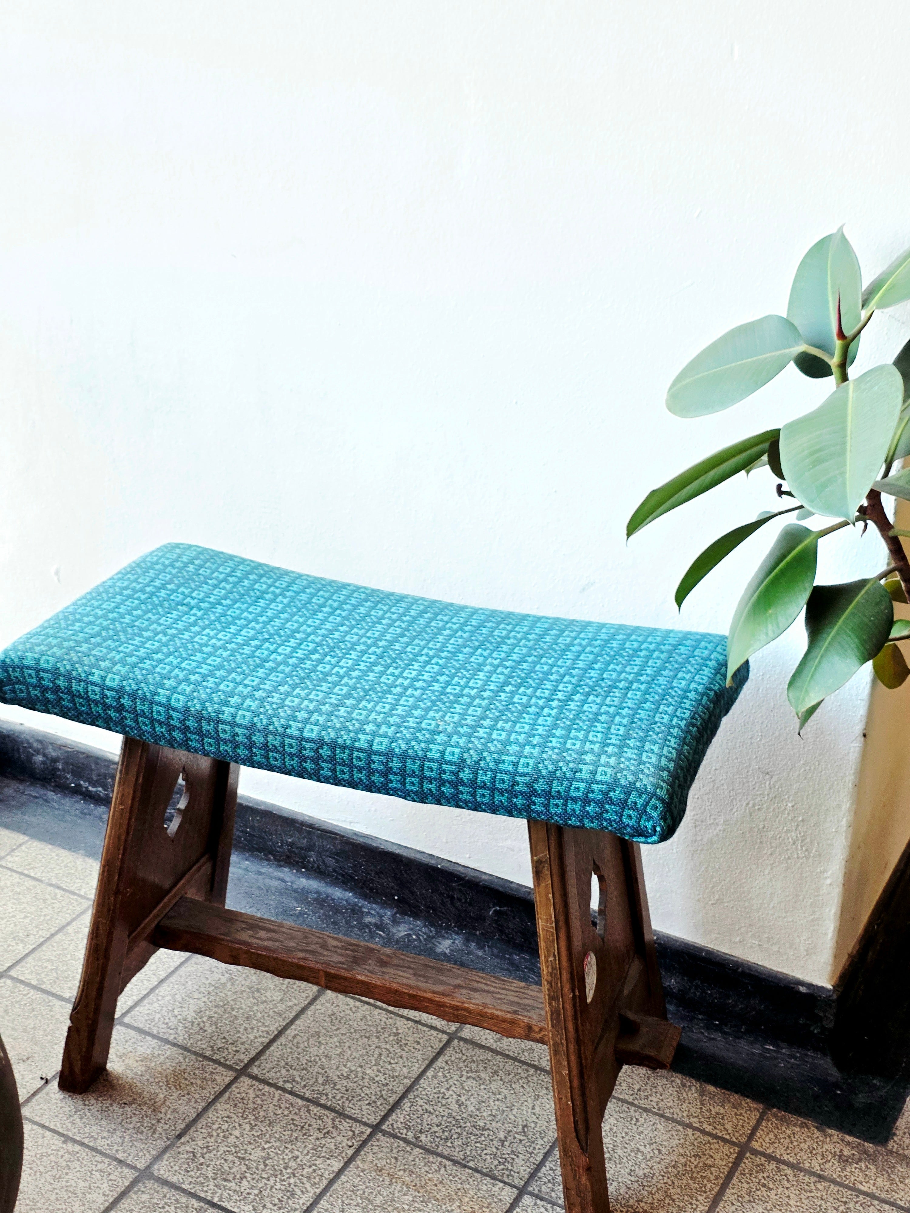 The stool has been beautifully updated with a vibrant turquoise and emerald woven fabric, secured with classic ornamental silver upholstery tacks.