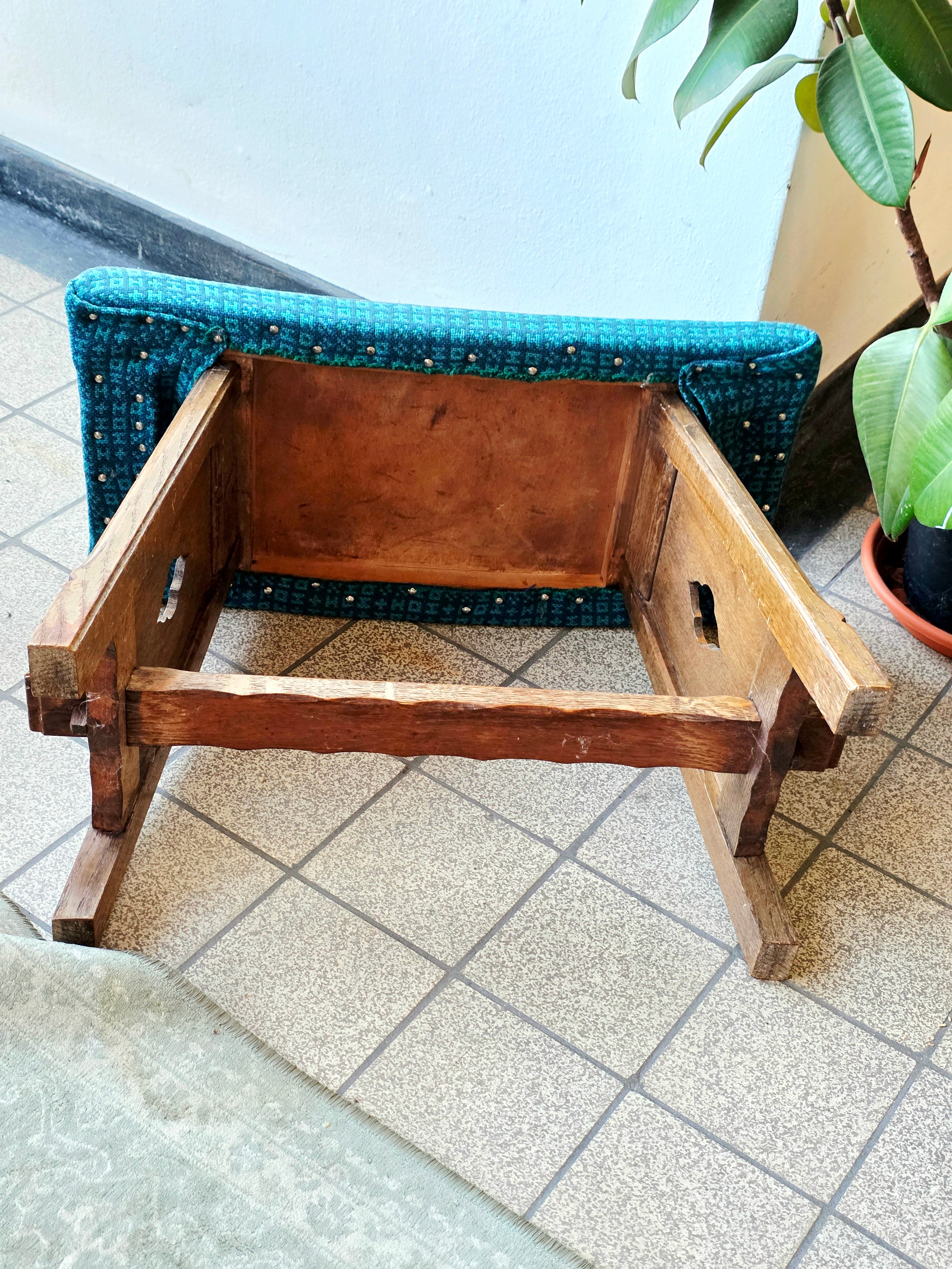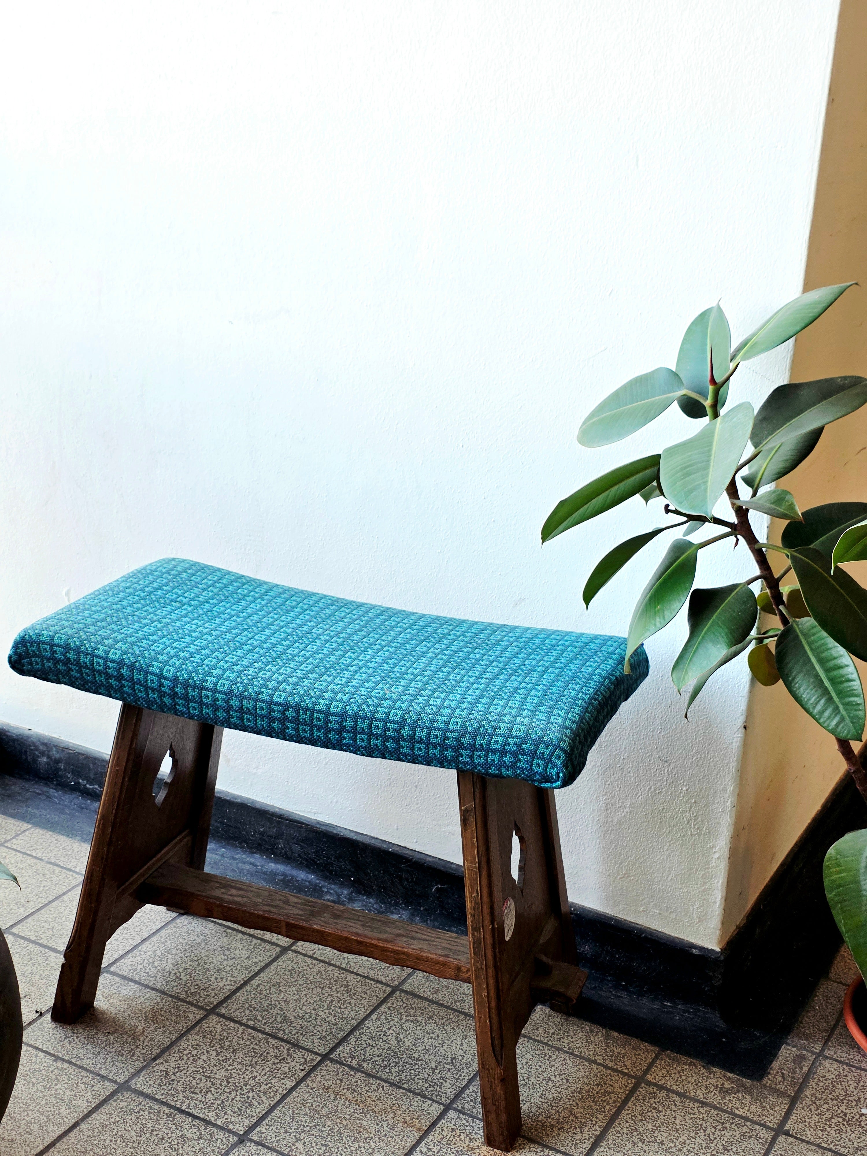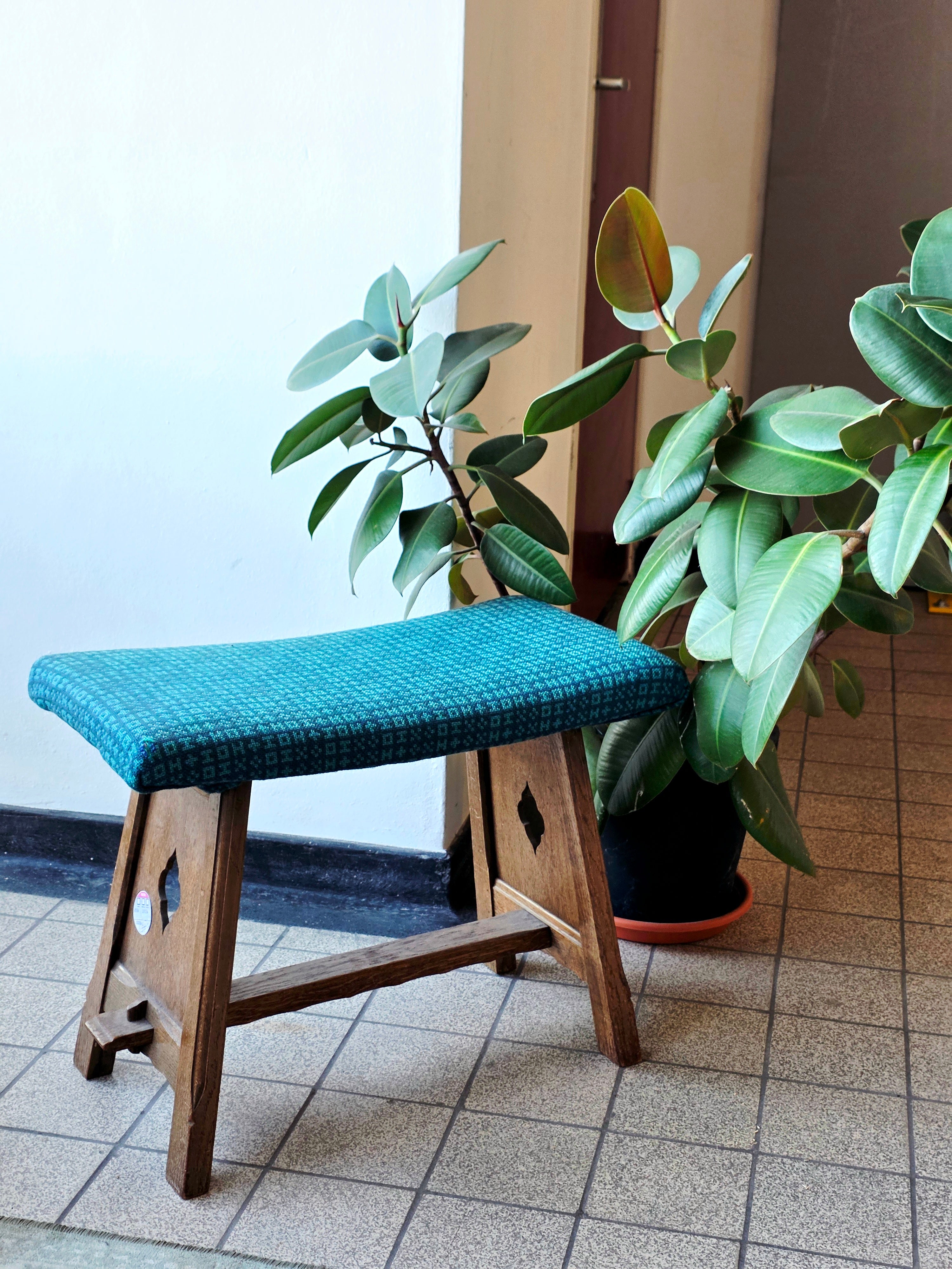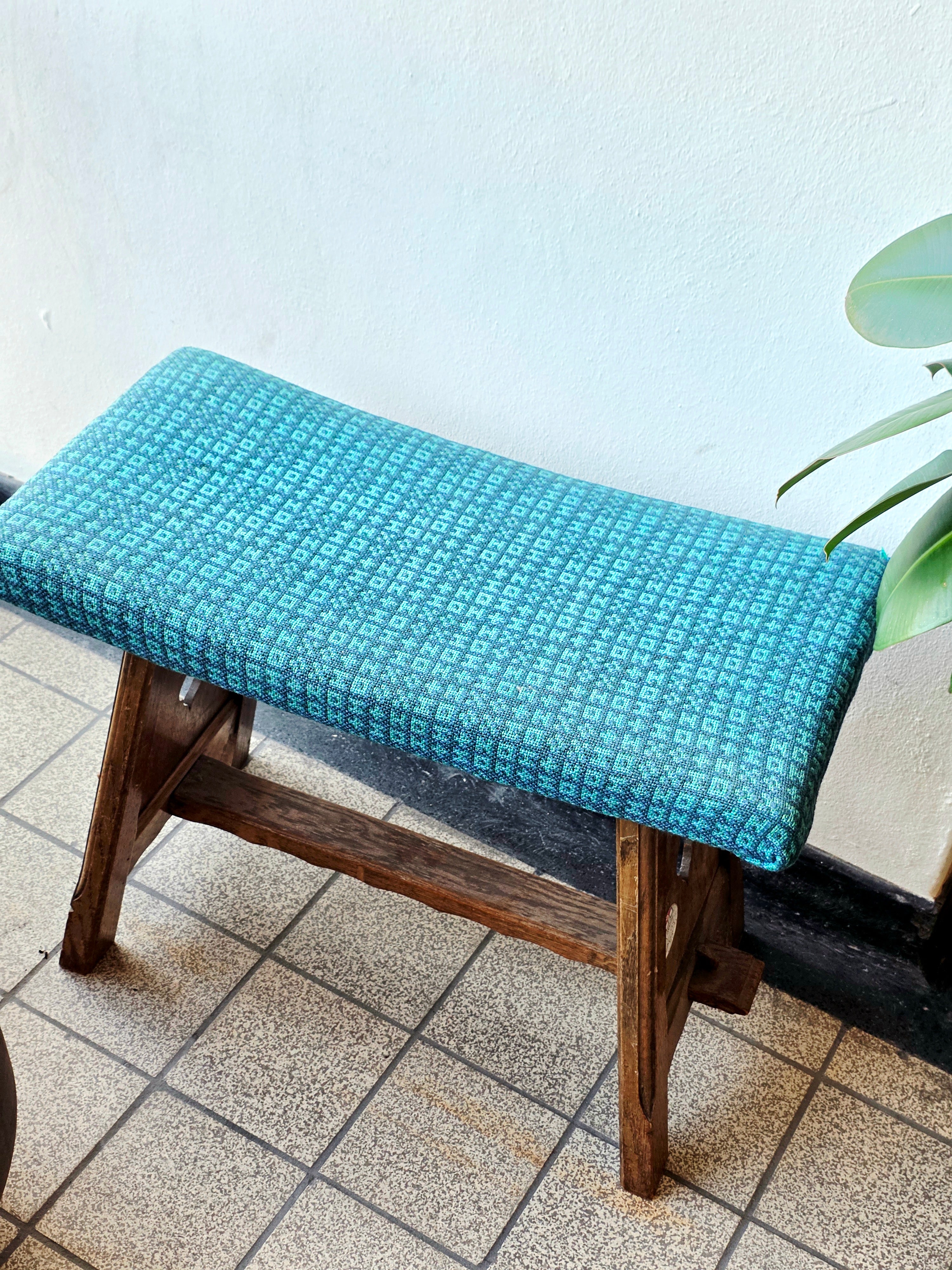The stool has been beautifully updated with a vibrant turquoise and emerald woven fabric, secured with classic ornamental silver upholstery tacks.